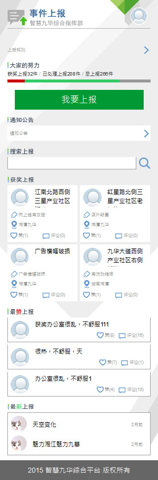 事(shì)件(jiàn)上報前台主要功能有:提交上報、搜索上報、查看(kàn)獲獎上報、查看(kàn)最贊上報、查看(kàn)最新上報等操作(zuò)。提交上報操作(zuò)前須關注“九華人(rén)”微信公衆号,并進行帳号注冊後才可(kě)進行操作(zuò)。