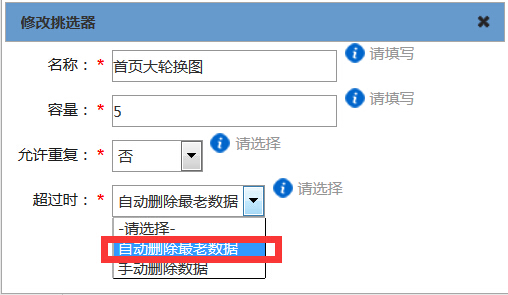 注:修改挑選器容量(即幾圖輪換)和是否允許重複的文章(zhāng)圖片播放(fàng)也是此操作(zuò)步驟,隻是修改“容量”後的數值,或選擇“允許重複”的是與否。
