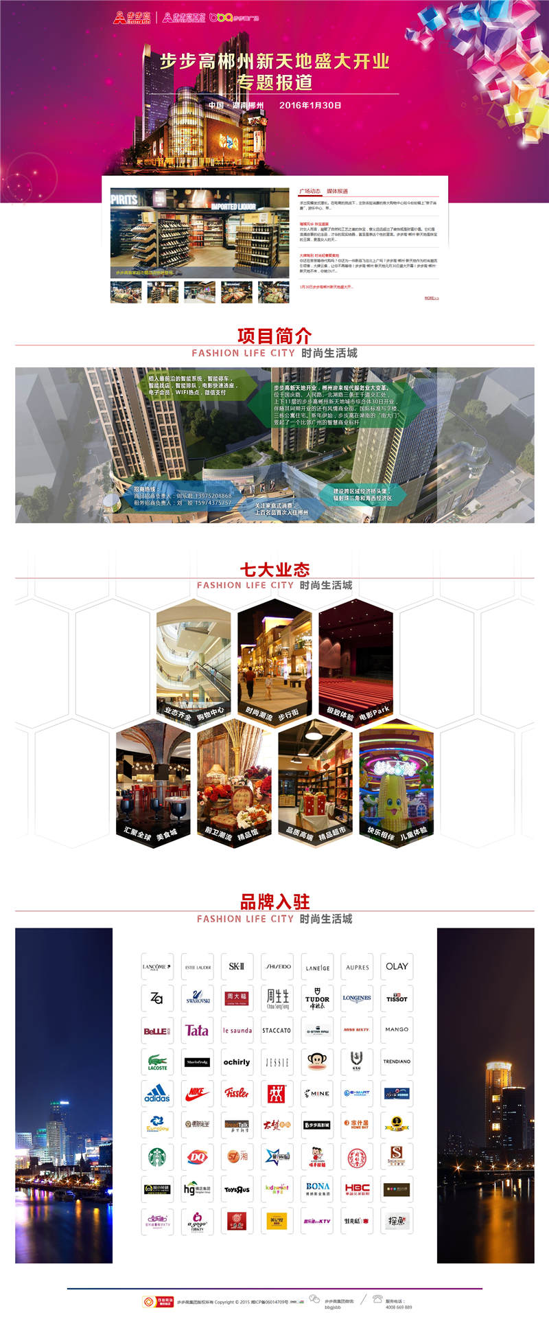 步步高集團爲慶祝步步高郴州新天地盛大(dà)開業特制作(zuò)此專題,由貝一科(kē)技設計(jì)制,專題美工(gōng)以喜慶、時尚爲主題,用大(dà)幅的用圖來(lái)展示項目簡介、品牌入駐等内容。獲得(de)步步高文化宣傳部的一緻好評。