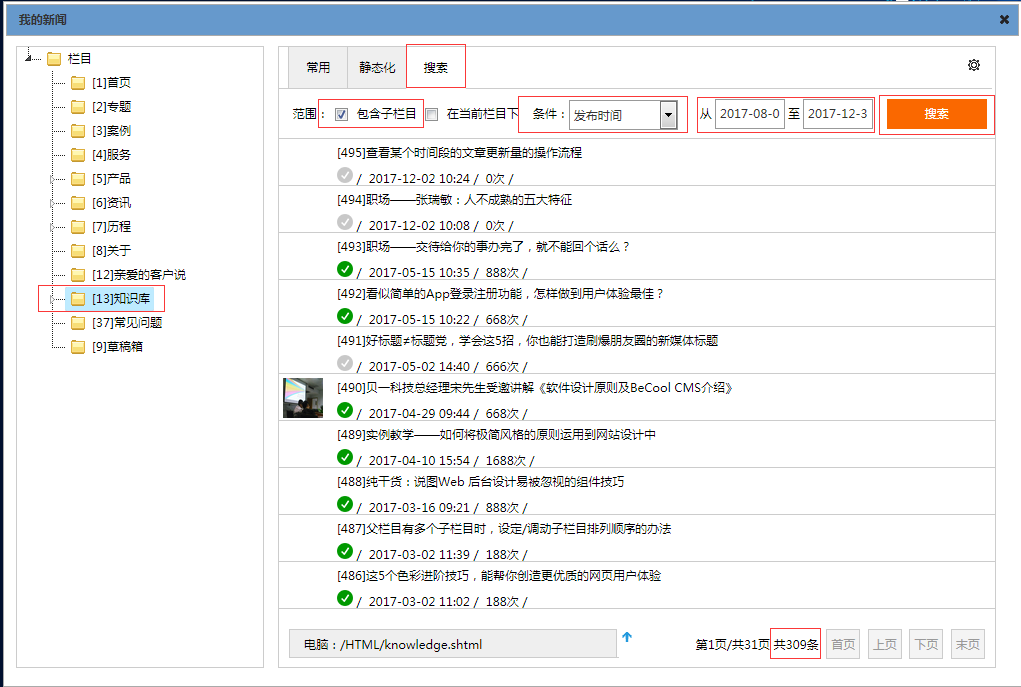 3、如(rú)下圖中的操作(zuò),就(jiù)是統計(jì)“知識庫”欄目底下,從(cóng)2017-08-01至2017-12-30的文章(zhāng)更新量的操作(zuò),留意紅(hóng)框;