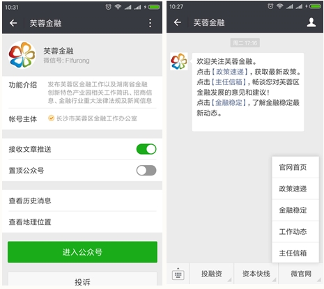 “芙蓉金融”服務号介紹及關注界面