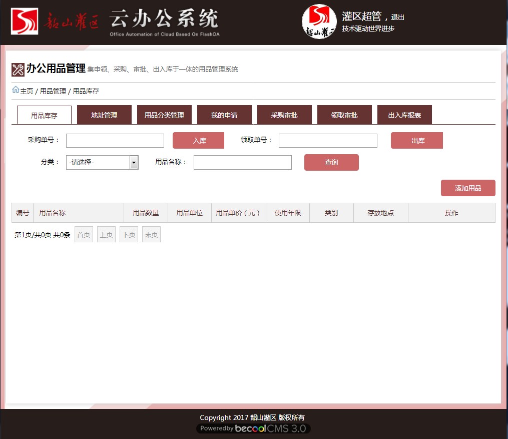 本模塊名爲辦公用品管理(lǐ),用于韶灌辦公區域的用品管理(lǐ)。特點是操作(zuò)簡單方便,能滿足對用品的各種操作(zuò),這是集申領、采購(gòu)、審批、出入庫于一體(tǐ)的用品管理(lǐ)系統。 |